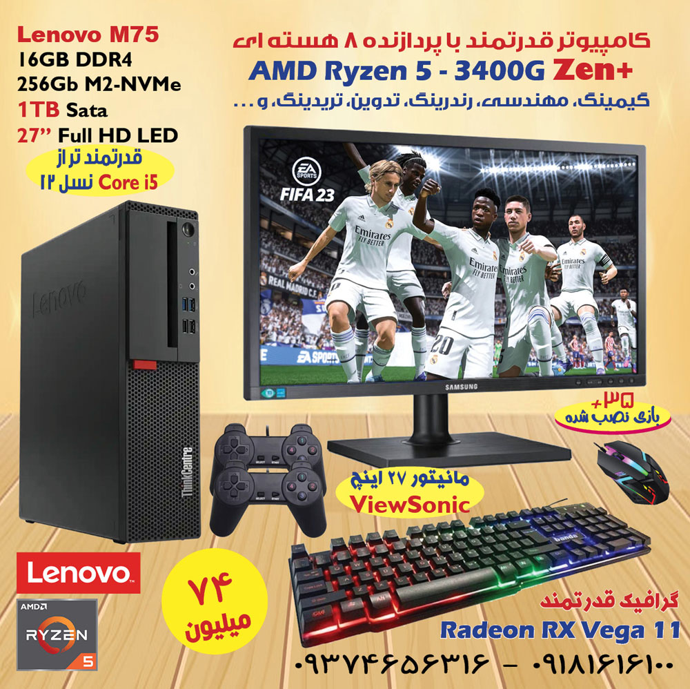 ⭐️ کامپیوتر دسکتاپ قدرتمند با کیس اریجینال وارداتی Lenovo M75 با پردازنده قدرتمند 8 هسته ای Ryzen 5 3400G و کانفیگ بالا بعلاوه مانیتور 24 اینچ فول اچ دی ایده آل برای گیمینگ، رندرینگ و مهندسی